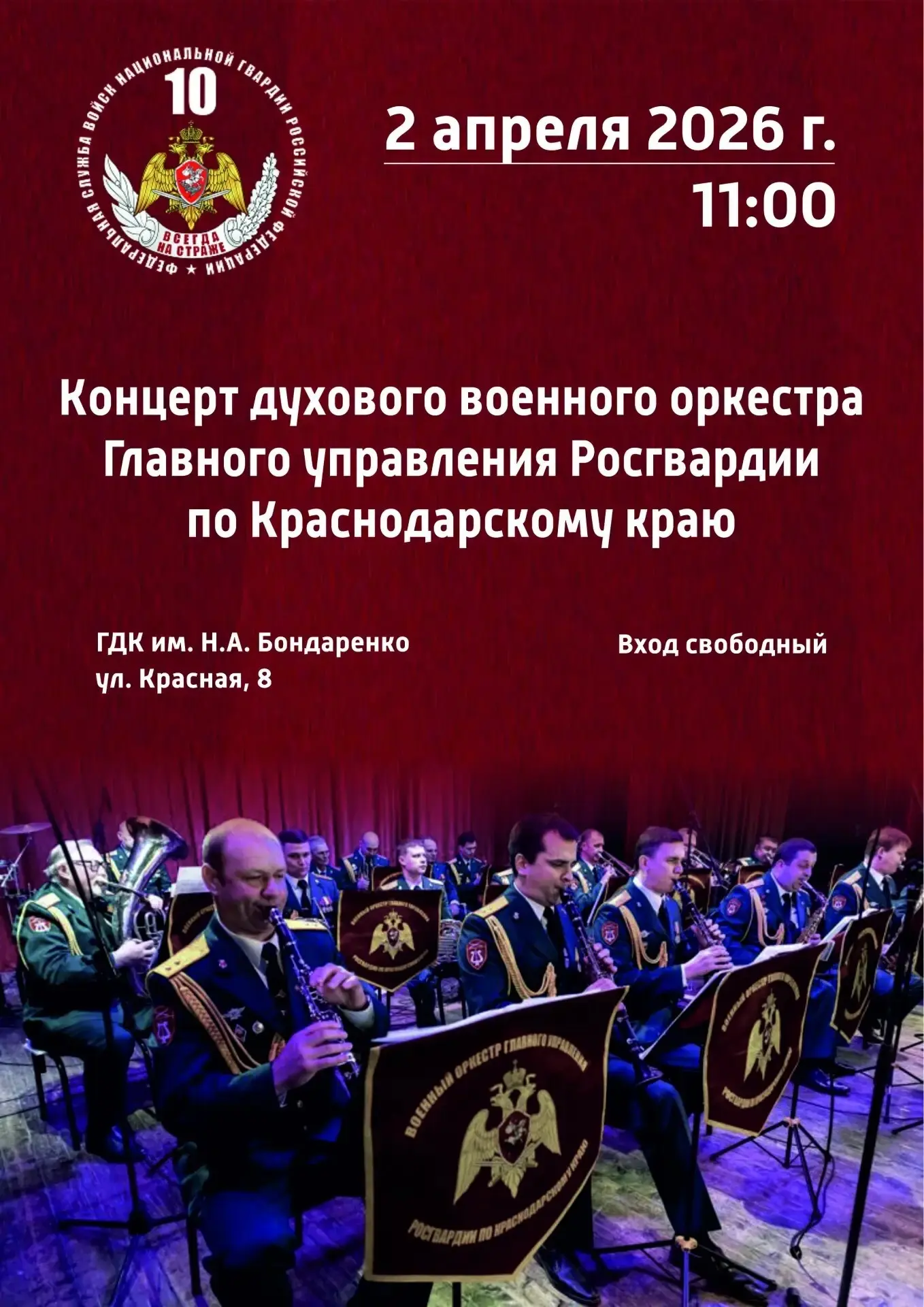 Дорогие жители Славянского района! Приглашаем вас на праздничный концерт, посвященный 10-летию создания Федеральной службы войск национальной гвардии Российской Федерации и 215-й годовщине войск правопорядка. Концерт состоится 2 апреля в 11:00 часов в городском Доме культуры. Вход свободный. Это событие станет